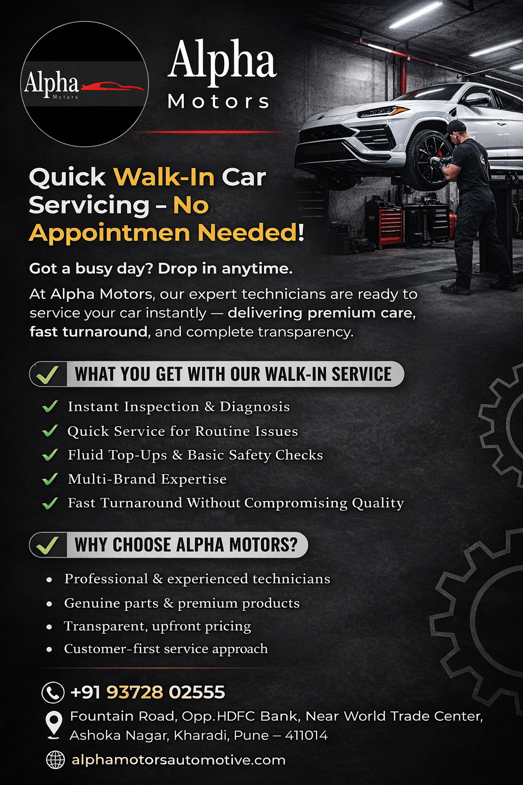 Alpha Motors Quick Walk-In Car Servicing – No Appointment Needed! Got a busy day? Drop in anytime. At Alpha Motors, our expert technicians are ready to service your car instantly — delivering premium care, fast turnaround, and complete transparency. What You Get With Our Walk-In Service ✔ Instant Inspection & Diagnosis ✔ Quick Service for Routine Issues ✔ Fluid Top-Ups & Basic Safety Checks ✔ Multi-Brand Expertise ✔ Fast Turnaround Without Compromising Quality Why Choose Alpha Motors? • Professional & experienced technicians • Genuine parts & premium products • Transparent, upfront pricing • Customer-first service approach +91 93728 02555 📍 Fountain Road, Opp. HDFC Bank, Near World Trade Center, Ashoka Nagar, Kharadi, Pune – 411014 🌐 alphamotorsautomotive.com