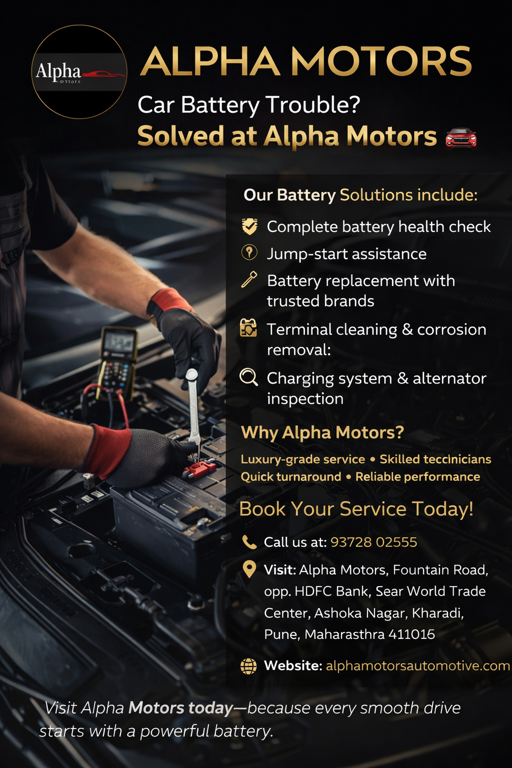 Don’t let a weak battery stop your drive. At Alpha Motors, we diagnose and fix battery issues with precision and premium care—so you’re back on the road with confidence. Our Battery Solutions Include: • Complete battery health check • Jump-start assistance • Battery replacement with trusted brands • Terminal cleaning & corrosion removal • Charging system & alternator inspection Why Alpha Motors? Luxury-grade service • Skilled technicians • Quick turnaround • Reliable performance Book Your Service Today! Keep your vehicle comfortable, safe, and ready for winter roads. 📞 Call us at: 93728 02555 * Visit: Alpha Motors, Fountain Road, opp. HDFC Bank, near World Trade Center, Ashoka Nagar, Kharadi, Pune, Maharashtra 411014 * Website: alphamotorsautomotive.com * Visit Alpha Motors today—because every smooth drive starts with a powerful battery.
