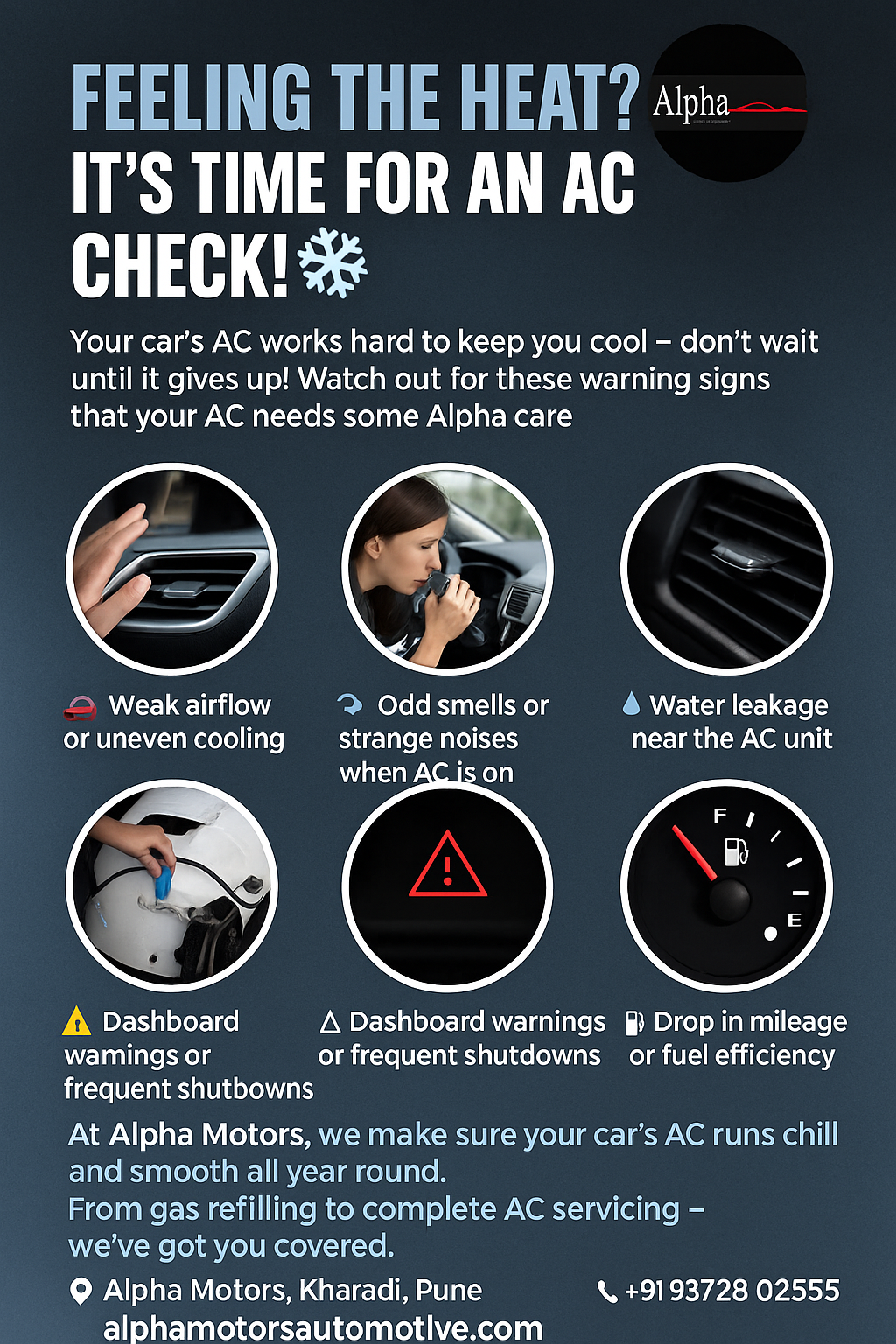 Feeling the Heat? It’s Time for an AC Check! Your car’s AC works hard to keep you cool — don’t wait until it gives up! Watch out for these warning signs that your AC needs some Alpha care 👇 • Weak airflow or uneven cooling • Odd smells or strange noises when AC is on • Water leakage near the AC unit • Dashboard warnings or frequent shutdowns • Drop in mileage or fuel efficiency At Alpha Motors, we make sure your car’s AC runs chill and smooth all year round. From gas refilling to complete AC servicing — we’ve got you covered. •Stay Cool. Drive Fresh. Every Time. • Alpha Motors, Kharadi, Pune 📞 +91 93728 02555 🌐 alphamotorsautomotive.com