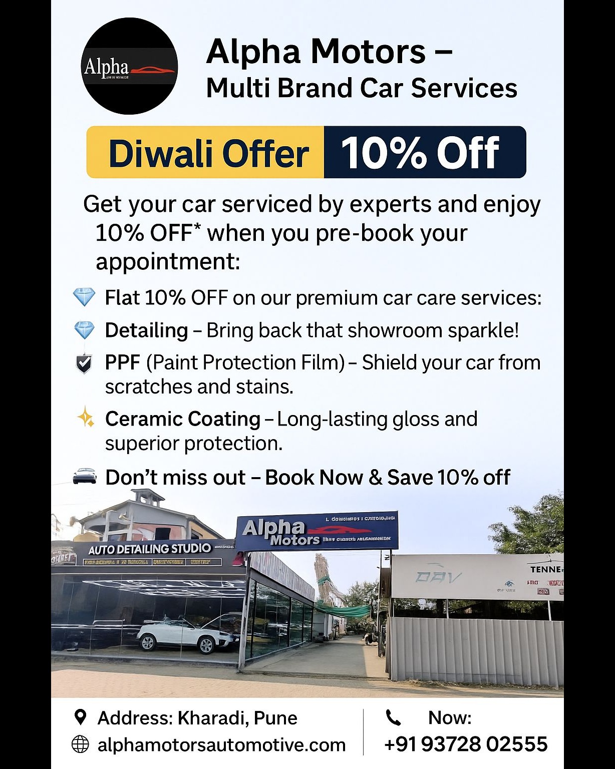 Brighten Your Ride This Diwali with Alpha Motors! Celebrate the festival of lights by giving your car the glow it deserves! Get Flat 10% OFF on our premium car care services when you pre-book your appointment this festive season. Our Premium Services Include: * Detailing: Bring back that showroom-new shine. * PPF (Paint Protection Film): Guard your car against scratches and stains. * Ceramic Coating: Add long-lasting gloss and protection. * Don’t wait — book now and save 10%! * Location: Kharadi, Pune * Call: +91 93728 02555 * Visit: alphamotorsautomotive.com