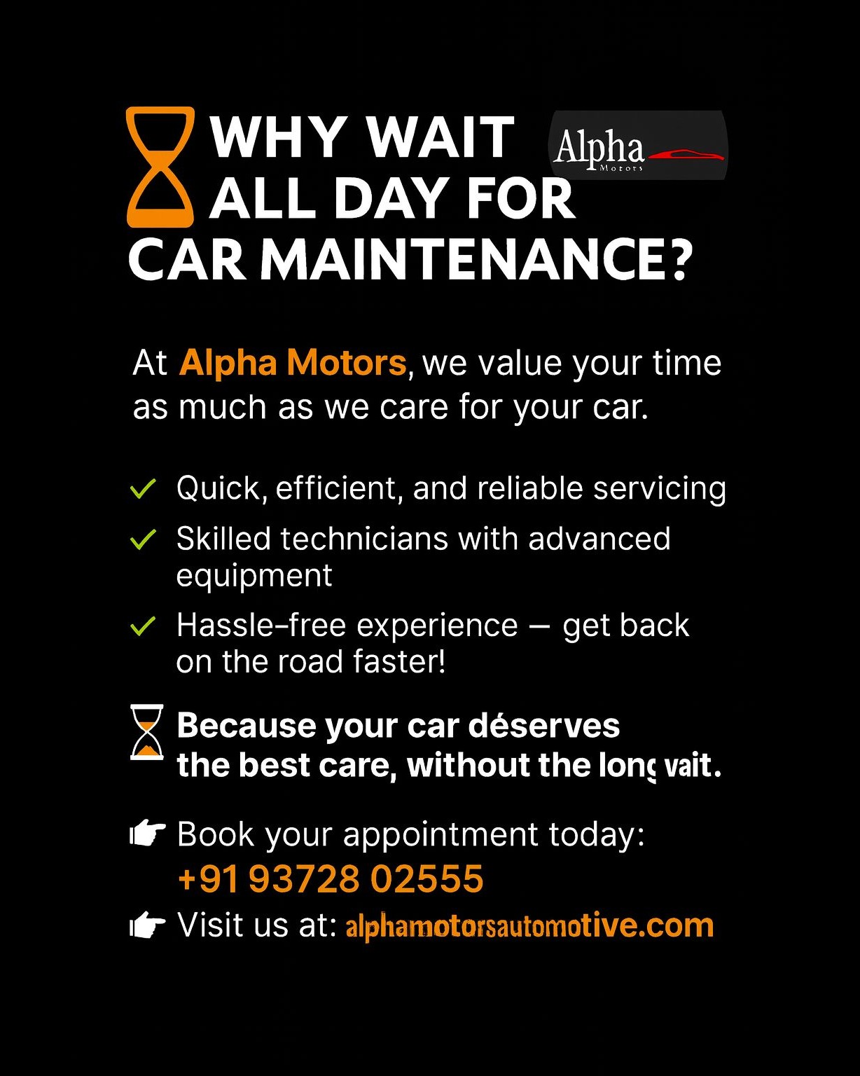 At Alpha Motors, we believe your time is just as valuable as your car. That’s why we offer: * Quick, reliable servicing you can count on * Expert technicians with advanced equipment * Hassle-free experience to get you back on the road faster * Because your car deserves the best care without the long wait. Book your appointment today: +91 93728 02555 Visit us: alphamotorsautomotive.com
