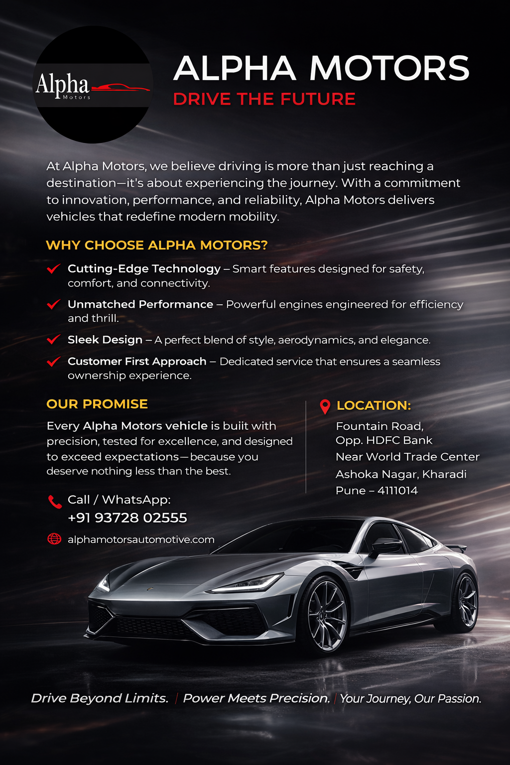 Alpha Motors – Drive the Future At Alpha Motors, we believe driving is more than just reaching a destination—it’s about experiencing the journey. With a commitment to innovation, performance, and reliability, Alpha Motors delivers vehicles that redefine modern mobility. Why Choose Alpha Motors? • Cutting-Edge Technology – Smart features designed for safety, comfort, and connectivity. • Unmatched Performance – Powerful engines engineered for efficiency and thrill. • Sleek Design – A perfect blend of style, aerodynamics, and elegance. • Customer First Approach – Dedicated service that ensures a seamless ownership experience. Our Vision To revolutionize the automotive industry by creating sustainable, high-performance vehicles that inspire confidence and elevate everyday driving. Our Promise Every Alpha Motors vehicle is built with precision, tested for excellence, and designed to exceed expectations—because you deserve nothing less than the best. 📞 Contact Us: • Call or WhatsApp: +91 93728 02555 • Website: alphamotorsautomotive.com ⸻ 📍 Location: Fountain Road, Opp. HDFC Bank Near World Trade Center Ashoka Nagar, Kharadi Pune – 411014