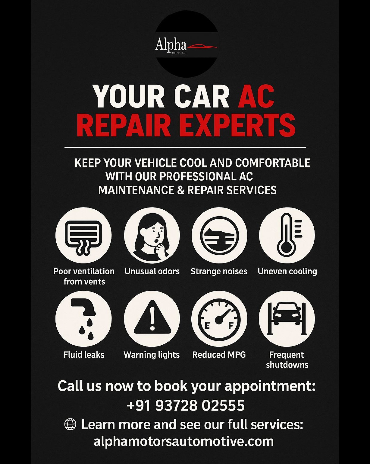Alpha Motors – Stay Cool, Drive Smooth Keep your drives fresh and comfortable with our expert Car AC Services. We fix it all – from poor ventilation and strange noises to fluid leaks and reduced mileage. * Advanced AC Diagnostics * Genuine Parts & Fluids * Quick, Reliable Service * Comfort That Lasts * Call us now to book your transformation: +91 93728 02555 * Learn more: alphamotorsautomotive.com
