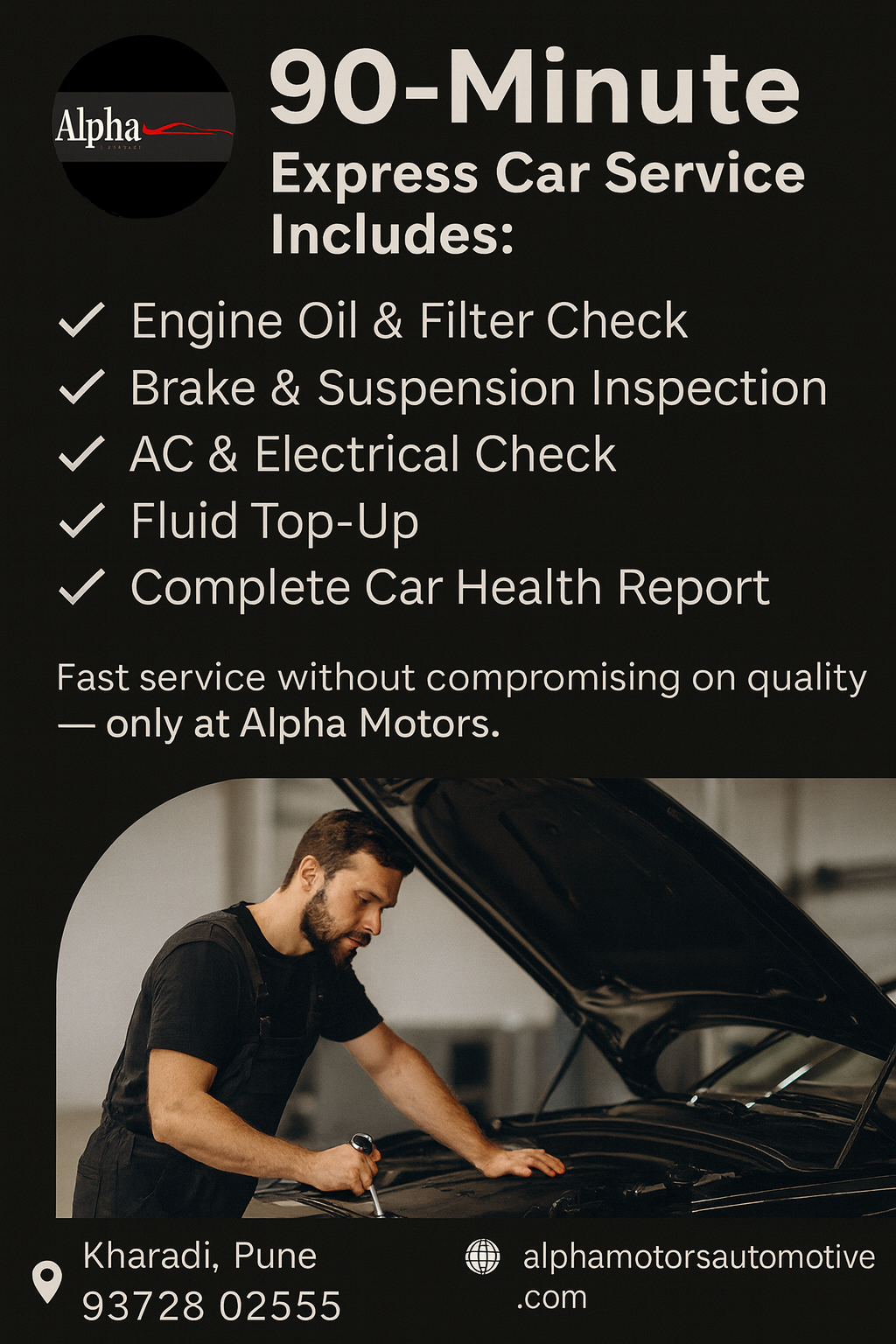90-Minute Express Car Service at Alpha Motors! Get back on the road faster — with top-quality servicing done in just 90 minutes. What’s Included: ✔ Engine Oil & Filter Check ✔ Brake & Suspension Inspection ✔ AC & Electrical System Check ✔ Essential Fluid Top-Up ✔ Complete Car Health Report Why Choose Alpha Motors? ✨ Fast Service ✨ Expert Technicians ✨ Premium Care ✨ No Compromise on Quality Location: Kharadi, Pune Call on: 93728 02555 Website: alphamotorsautomotive.com Alpha Motors — Because Your Time Matters and Your Car Deserves the Best.
