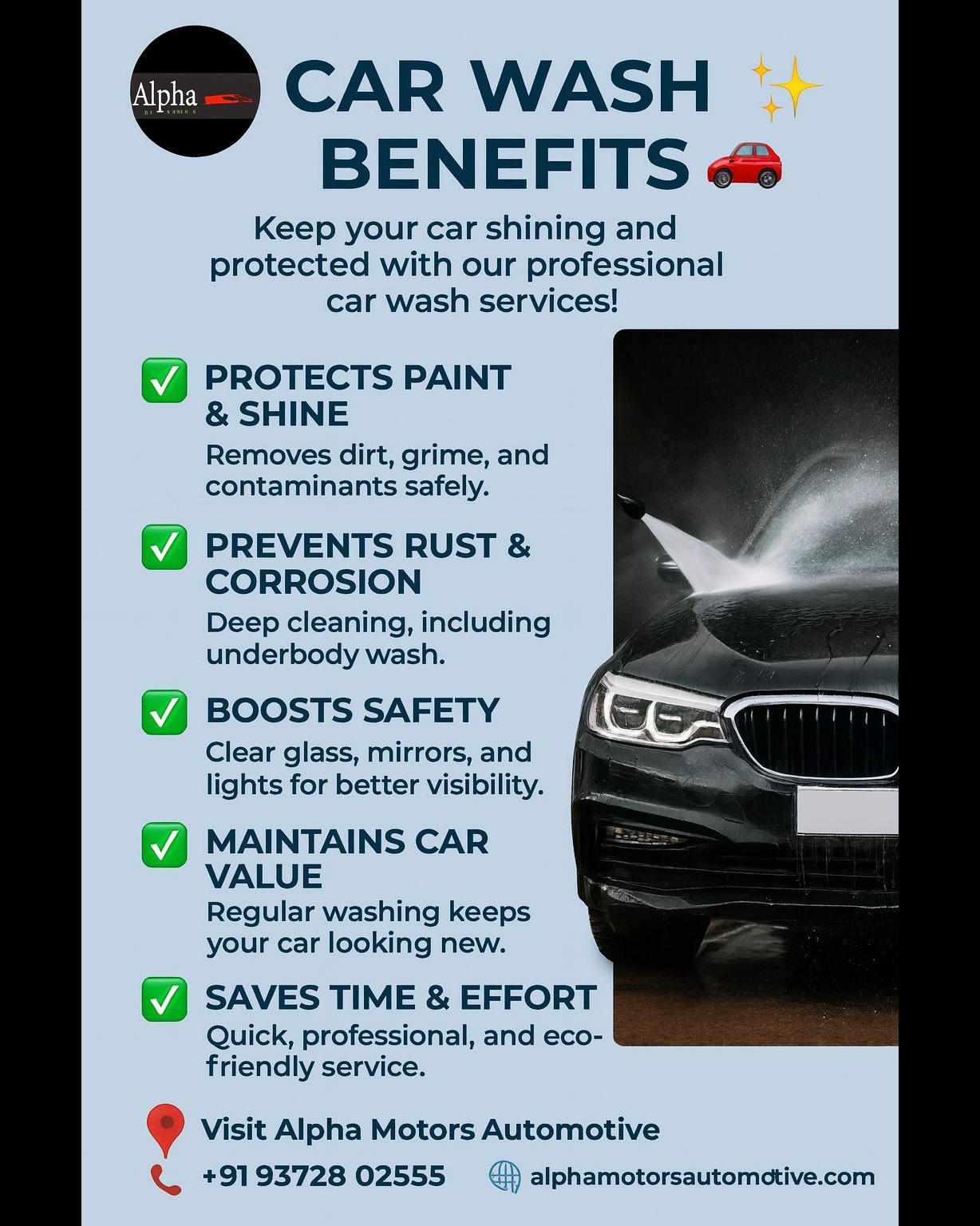 Car Wash Benefits at Alpha Motors Keep your car shining and protected with our professional car wash services! * Protects Paint & Shine – Removes dirt, grime, and contaminants safely. * Prevents Rust & Corrosion – Deep cleaning, including underbody wash. * Boosts Safety – Clear glass, mirrors, and lights for better visibility. * Maintains Car Value – Regular washing keeps your car looking new. * Saves Time & Effort – Quick, professional, and eco- friendly service. Visit Alpha Motors Automotive +91 93728 02555 🌐 alphamotorsautomotive.com