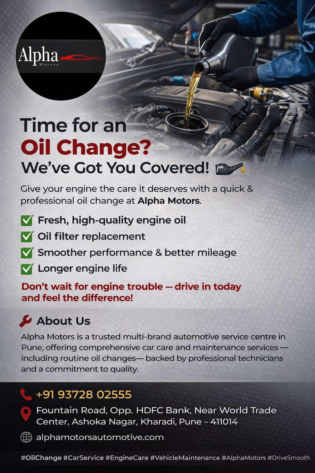 Time for an Oil Change? We’ve Got You Covered! Give your engine the care it deserves with a quick & professional oil change at Alpha Motors. * Fresh, high-quality engine oil * Oil filter replacement * Smoother performance & better mileage * Longer engine life Don’t wait for engine trouble — drive in today and feel the difference! About Us Alpha Motors is a trusted multi-brand automotive service centre in Pune, offering comprehensive car care and maintenance services — including routine oil changes — backed by professional technicians and a commitment to quality. 📞 Book your service now +91 93728 02555 📍 Fountain Road, Opp. HDFC Bank, Near World Trade Center, Ashoka Nagar, Kharadi, Pune – 411014 🌐 alphamotorsautomotive.com