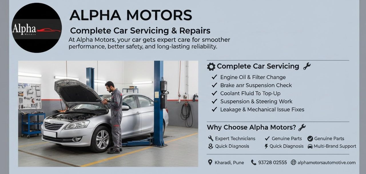 Complete Car Servicing & Repairs – Alpha Motors At Alpha Motors, your car receives expert care from skilled technicians who ensure smooth performance, safety, and long-lasting reliability. 🔧 Complete Car Servicing * Engine Oil & Filter Replacement * Full Car Inspection * Brake & Suspension Check * Coolant & Fluid Top-Up * Air & Fuel Filter Cleaning/Replacement * Tyre Rotation & Pressure Check ⚙️ Major & Minor Repairs * Engine Repair & Overhauling * Brake Repair & Replacement * Suspension & Steering Work * Clutch & Transmission Repairs * Leakage Fixes & Mechanical Issues ⸻ Why Choose Alpha Motors? * Expert Technicians * Genuine Parts * Quick Diagnosis * Multi-Brand Car Support * Location: Kharadi, Pune * Call On: 93728 02555 * Website: alphamotorsautomotive.com