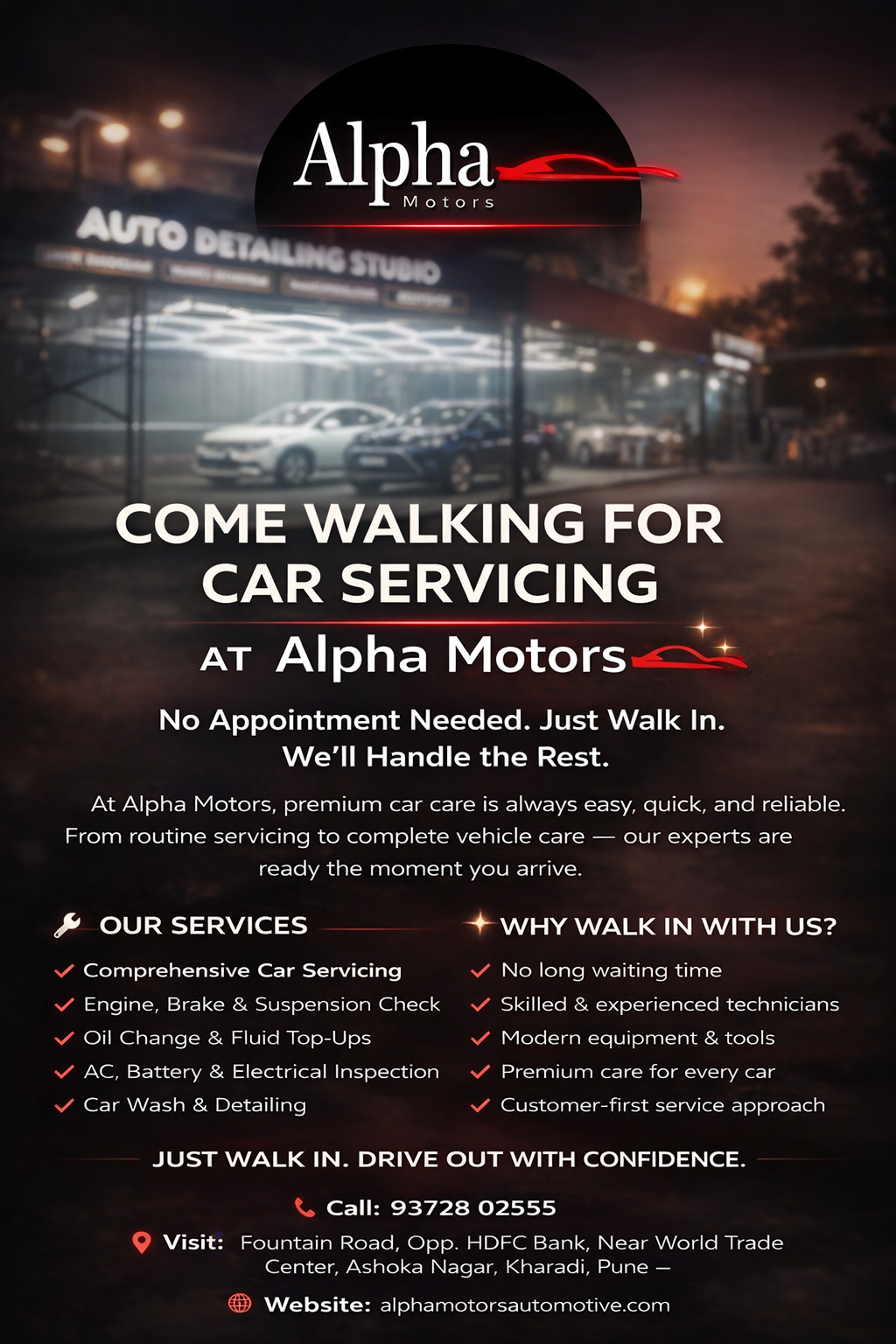 Looking for reliable walk-in car servicing near Kharadi, Pune? At Alpha Motors, you don’t need an appointment. Just walk in and get professional, premium car care from experienced technicians. We believe car servicing should be easy, transparent, and trustworthy. Whether your vehicle needs a quick inspection or complete servicing, our expert team is ready to assist you the moment you arrive. No Appointment Needed – Walk In for Car Service Today Skip long waiting times and advance bookings. Alpha Motors offers walk-in car servicing with modern tools, skilled professionals, and honest pricing — all under one roof. Our Car Servicing & Maintenance Services We provide comprehensive multi-brand car service solutions, including: • Comprehensive car servicing • Engine, brake & suspension inspection • Oil change & fluid top-ups • AC, battery & electrical diagnostics • Professional car wash & detailing • Accurate diagnosis with transparent pricing Why Choose Alpha Motors for Walk-In Car Servicing? • No appointment required • Minimal waiting time • Skilled & experienced technicians • Advanced diagnostic equipment • Premium care for all car brands • Customer-first service approach Your car receives the Alpha standard of care — every time. Visit Alpha Motors – Trusted Car Service Center in Kharadi 📍 Address: Fountain Road, Opp. HDFC Bank, Near World Trade Center, Ashoka Nagar, Kharadi, Pune, Maharashtra – 411014 📞 Call Us: 93728 02555 🌐 Website: alphamotorsautomotive.com Walk In. Drive Out With Confidence. Alpha Motors – Premium Walk-In Car Servicing in Pune.