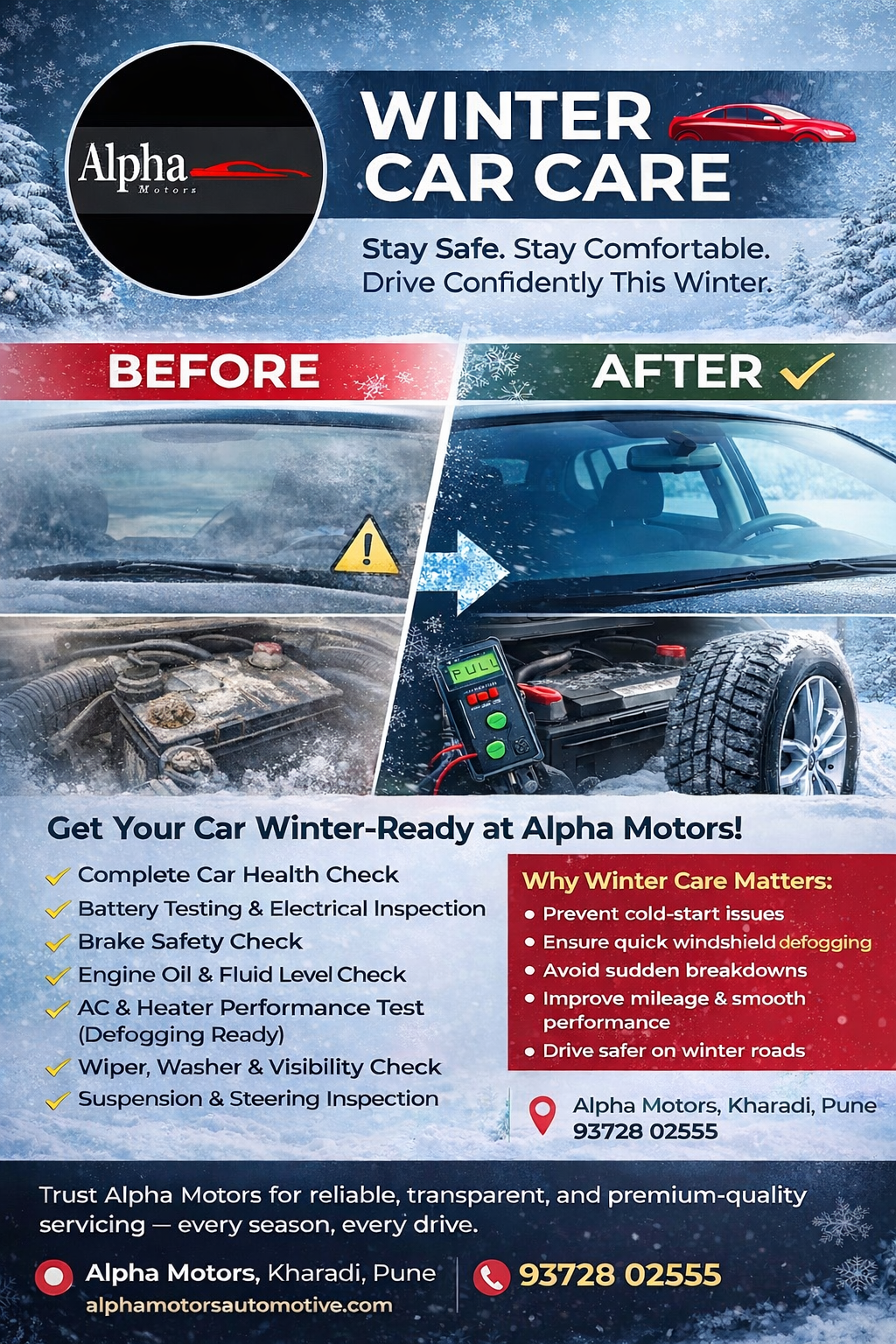 Stay Safe. Stay Comfortable. Drive Confidently This Winter. Cold weather can quietly affect your carβs performance. From foggy windshields to weak batteries, winter demands extra care β and Alpha Motors is here to help. π§ Our Winter Car Care Includes: β Complete Car Health Check β Battery Testing & Electrical Inspection β Brake Safety Check β Engine Oil & Fluid Level Check β AC & Heater Performance Test (Defogging Ready) β Wiper, Washer & Visibility Check β Suspension & Steering Inspection β¨ Why Winter Care Matters: β’ Prevent cold-start issues β’ Ensure quick windshield defogging β’ Avoid sudden breakdowns β’ Improve mileage & smooth performance β’ Drive safer on winter roads Get Your Car Winter-Ready with Expert Care Trust Alpha Motors for reliable, transparent, and premium-quality servicing β every season, every drive. π Alpha Motors, Kharadi, Pune π 93728 02555 π alphamotorsautomotive.com